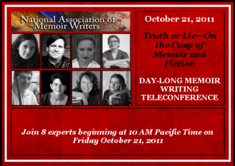 The National Association of Memoir Writers is showcasing talented authors and teachers who are experts in Creative Nonfiction and memoir for the first ever Teleconference on Truth or Lie—On the Cusp of Memoir and Fiction, for the bi-annual National Association of Memoir Writers Day-Long Memoir Writing Teleconference, scheduled for October 21, 2011.