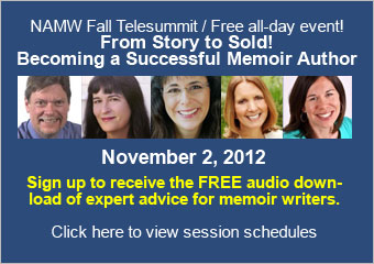 We had a wonderful Telesummit on November 2 with our guests Mike O’Mary who gave us some great tips and secrets for inexpensive book marketing; Lisa Cron explained how the brain works and who it needs to get hooked on a story; Frances Caballo had us all connected as we learned about social media for authors, and Nina Amir gave some useful information about blogging to create platform and even a book deal. Brooke Warner and Kami Wicoff completed our exhausting but exhilarating day by discussing the various publishing models in play today. Over 100 people were on some of the calls! Stay tuned for the next one in April 2013—another all day free event to give you the resources you need to write and publish your memoir. It will be our 5th anniversary Telesummit!
